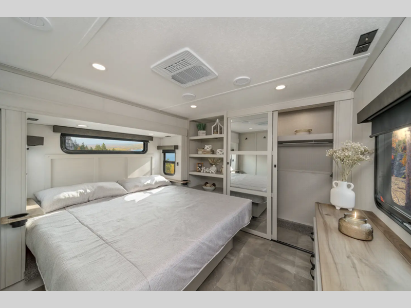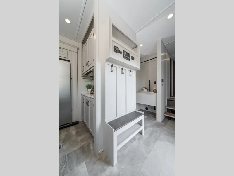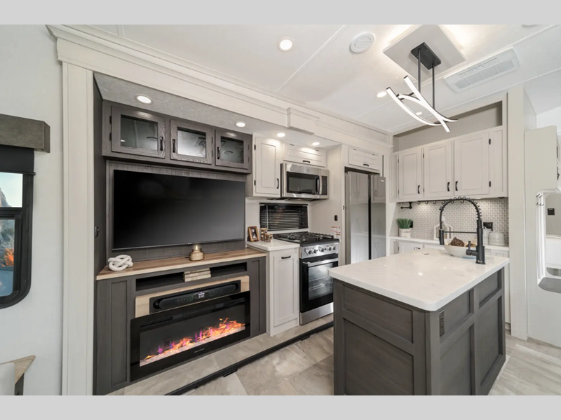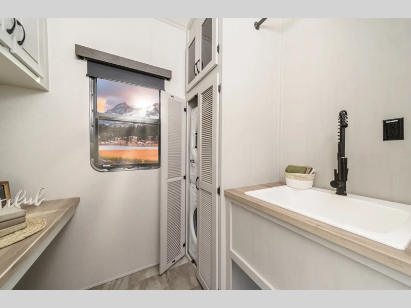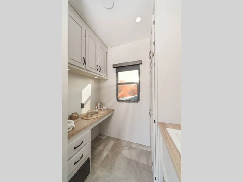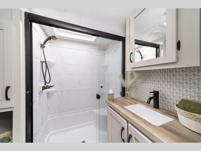The Tri-Tex powder coated frame technology is up to 5X more weather resistant, and the Road Armor Suspension by Trail Air includes heavy duty shackles and wet bolts for smooth towing. Each model includes a gear driven 6-point electric auto-leveling system, so you spend less time setting up and more time relaxing. You'll be pleasantly surprised to find at-home amenities throughout these fifth wheels, including solid surface countertops in the kitchen, slow rise roller night shades, a full-size shower with sliding glass doors, and so much more!