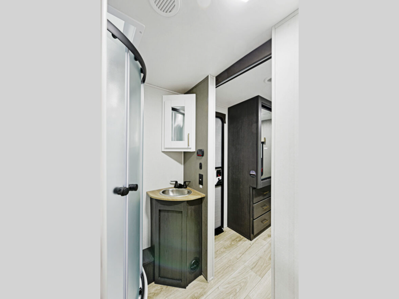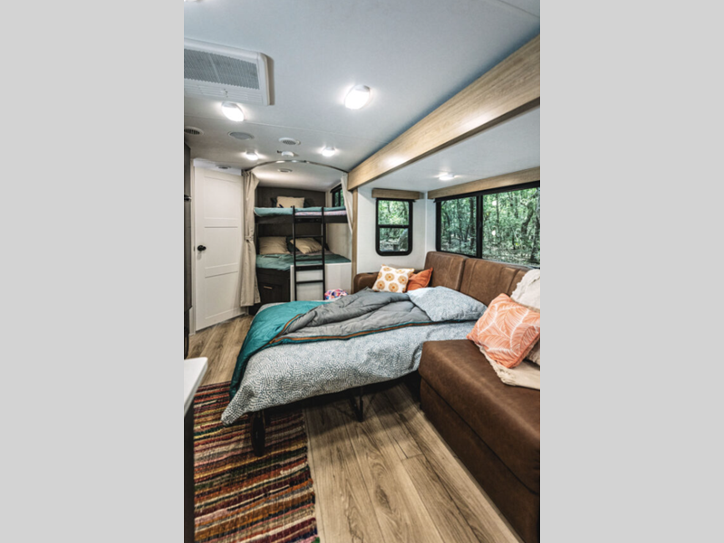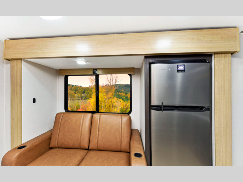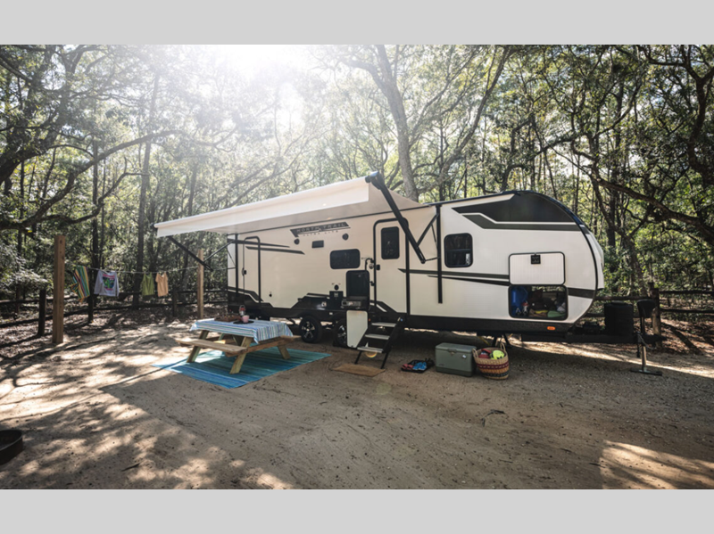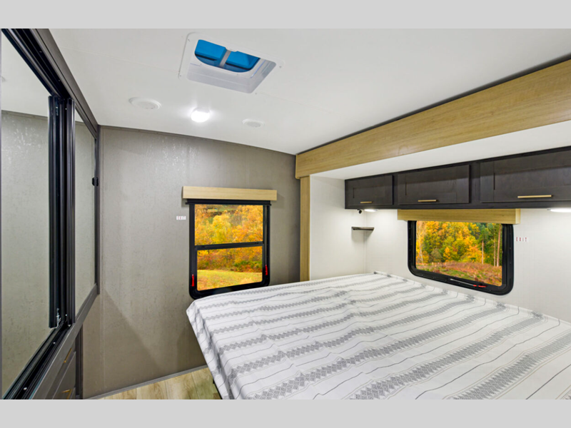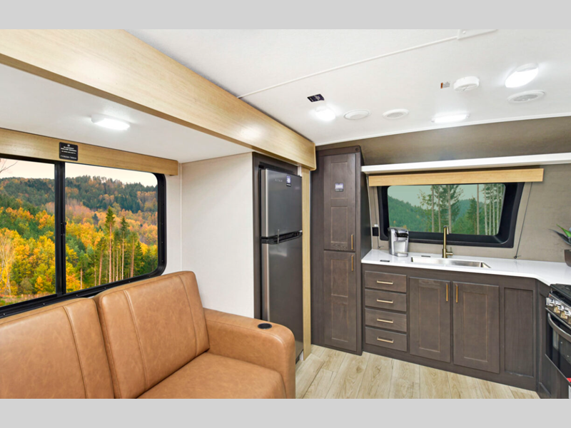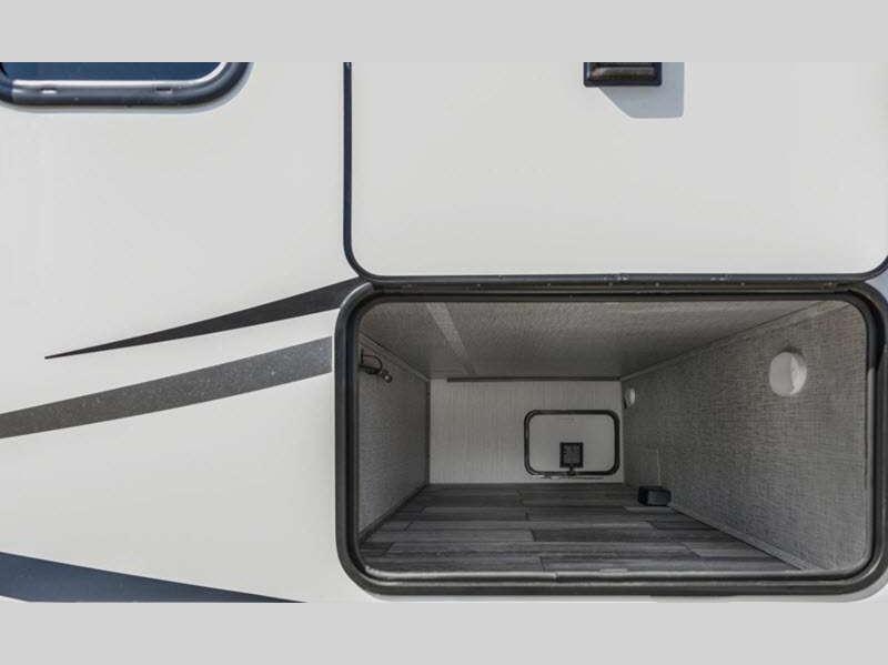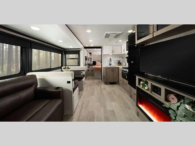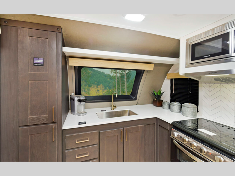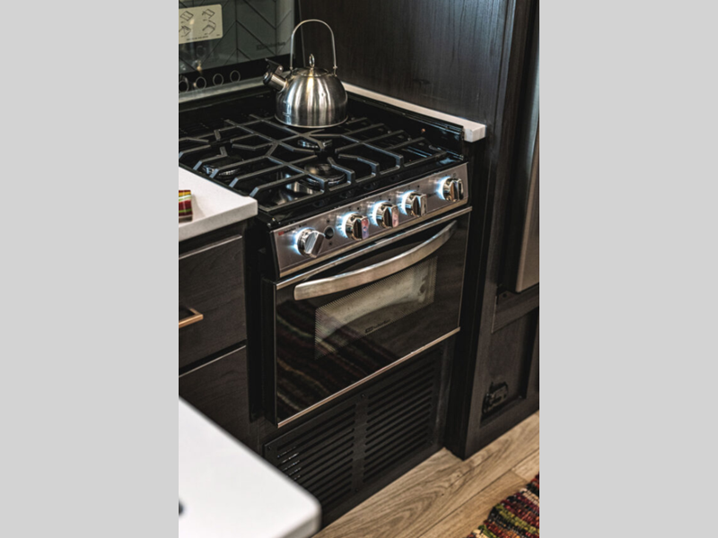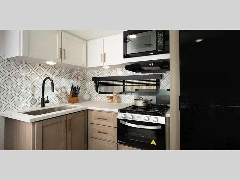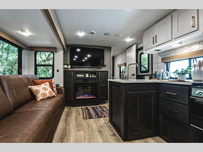 The power tongue jack and stabilizer jacks make set-up a breeze so you can get to camping right away, and since the underbelly is heated and enclosed, you can extend your camping season. Each model features King Kong sized pass-through storage to easily bring along hiking gear, fishing poles, and lawn chairs. You will love the modern interior with stainless steel appliances, butcher block style kitchen countertops, and upgraded and overstuffed residential furniture.