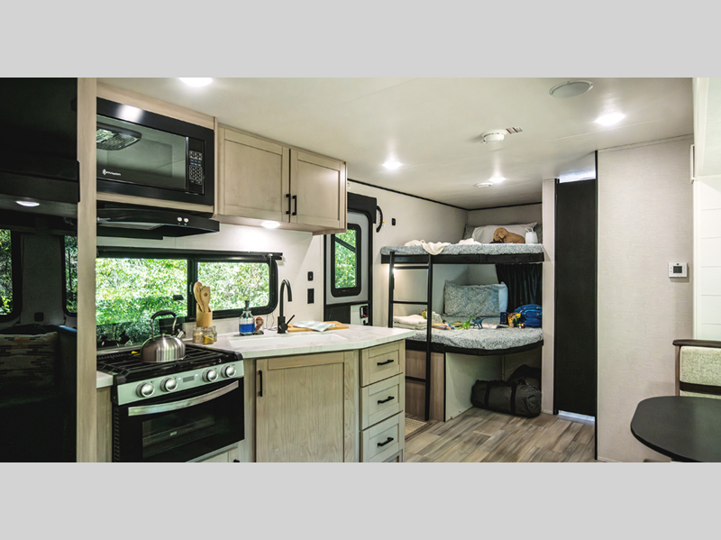 Sleeps 5 Length 22 ft 3 in Ext Width 8 ft Ext Height 0 ft Int Height 6 ft 6 in Interior Color Drift Stone Furnace BTU 19000 btu Number Of Bunks 2 Available Beds Queen Refrigerator Type 12V Refrigerator Size 8 cu ft Cooktop Burners 3 Number of Awnings 1 Axle Weight 4400 lbs LP Tank Capacity 20 lbs Water Heater Type On Demand Tankless Awning Info 12' Power Number of LP Tanks 1 Shower Type Tub/Shower Combo Electrical Service 30 amp Similar Floorplans