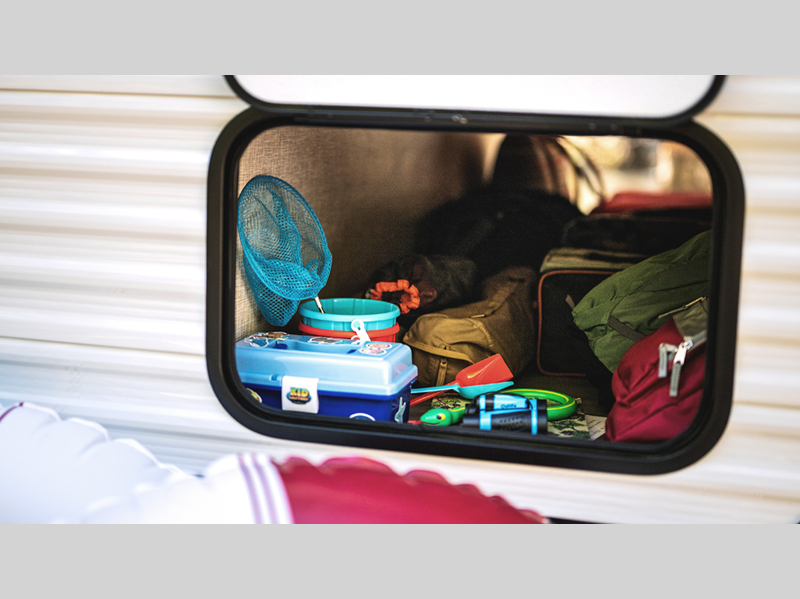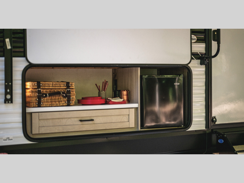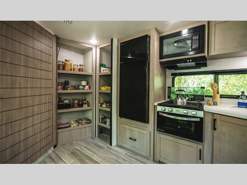 It will be effortless to enjoy time at the campground with interior comforts, such as vinyl flooring throughout, durable, residential-inspired kitchen countertops, and solid hardwood cabinet doors. The Camping in Comfort Package will add to each excursion with an on-demand tankless water heater, stabilizer jacks, and LED lights both inside and out!