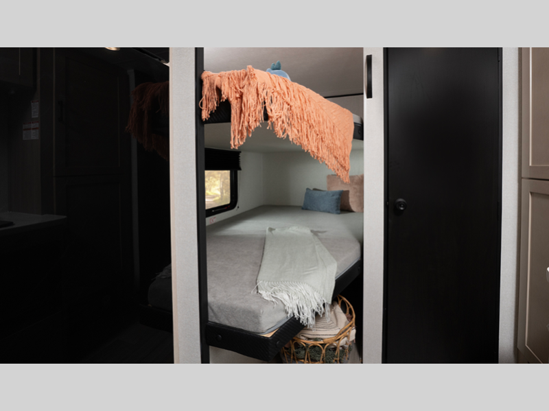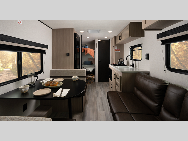 Sleeps 8 Slides 1 Length 23 ft 7 in Ext Width 8 ft Ext Height 10 ft 4 in Interior Color Drift Stone Hitch Weight 485 lbs GVWR 4800 lbs Dry Weight 3695 lbs Cargo Capacity 1105 lbs Fresh Water Capacity 30 gals Grey Water Capacity 20 gals Black Water Capacity 20 gals Tire Size ST225/75R15E Furnace BTU 19000 btu Number Of Bunks 2 Available Beds Queen Refrigerator Type 12V Cooktop Burners 2 Shower Size 24" x 40" Number of Awnings 1 LP Tank Capacity 20 lbs Water Heater Type On Demand Tankless AC BTU 8000 btu Awning Info 10' Power Axle Count 1 Number of LP Tanks 1 Shower Type Standard Electrical Service 30 amp Similar Floorplans