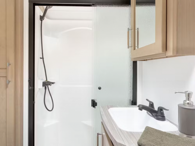 - Fiberglass, 1-piece shower surround, removable shower head, features built-in skylight
