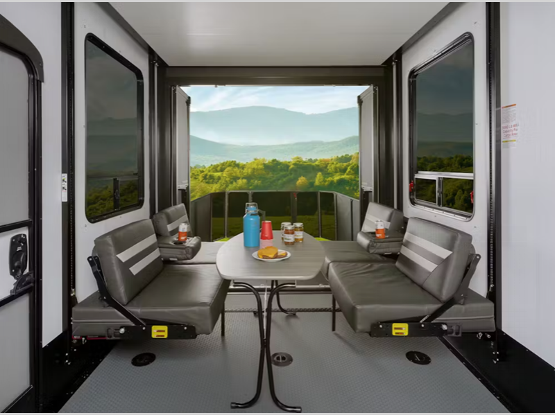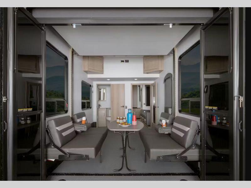 You will appreciate the DynaSpan floor decking in the garage that can withstand your adventures plus 5,000 lb. frame welded tie-downs to keep your toys secure. The Extreme Weather Package will help extend your camping season and the large tinted safety glass windows provide protection against the suns rays. Each model includes designer style vinyl flooring throughout, LED lighting, and many more interior comforts.