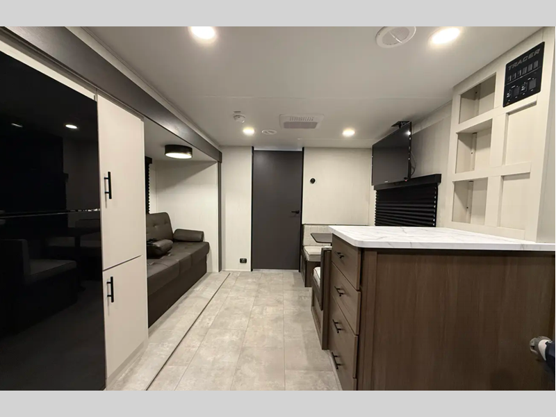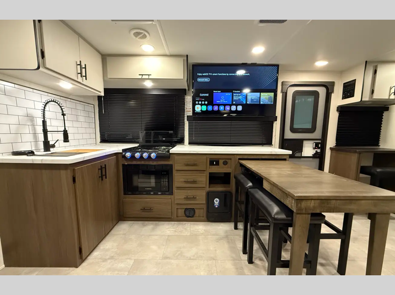 Sleeps 8 Slides 2 Length 34 ft 11 in Ext Width 8 ft Ext Height 10 ft 8 in Hitch Weight 780 lbs Dry Weight 6582 lbs Cargo Capacity 1198 lbs Fresh Water Capacity 42 gals Grey Water Capacity 34 gals Black Water Capacity 34 gals Furnace BTU 30000 btu Number Of Bunks 4 Available Beds Queen Refrigerator Type 12V Cooktop Burners 3 Number of Awnings 1 Water Heater Type Tankless AC BTU 15000 btu TV Info LR Smart TV Awning Info 19' Power w/LED Lighting Axle Count 2 Shower Type Standard Similar Floorplans